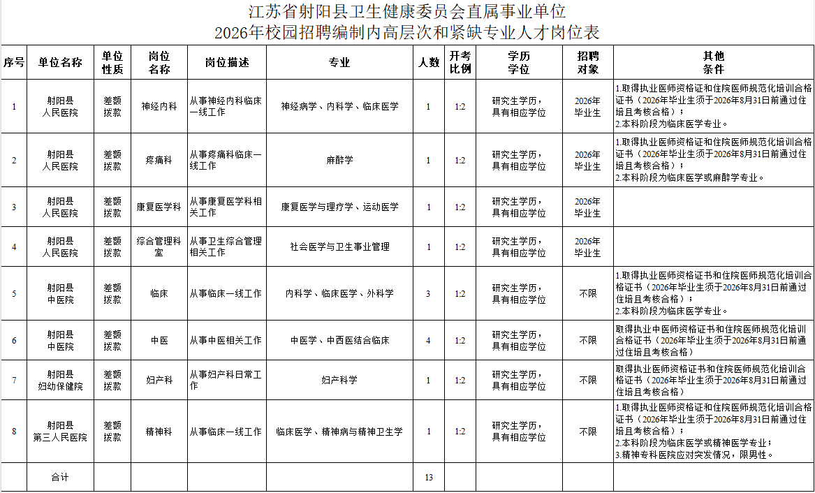 本次校园招聘岗位为射阳县卫健委直属事业单位中的专业技术岗位,均为事业编制人员,共招聘13人,详见《江苏省射阳县卫生健康委员会直属事业单位2026年校园招聘编制内高层次和紧缺专业人才岗位表》(附件1),以下简称《岗位表》。