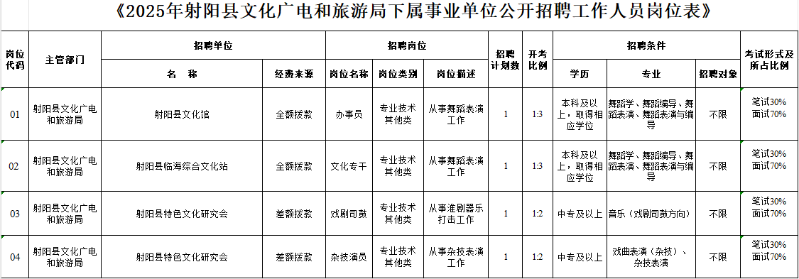 招聘岗位及条件等详见《2025年射阳县文化广电和旅游局下属事业单位公开招聘工作人员岗位表》(附件1,以下简称“《岗位表》”)。