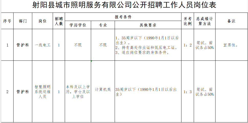 (三)报考岗位要求的学历、专业、年龄等资格条件详见附件1:《射阳县城市照明服务有限公司公开招聘工作人员岗位表》。
