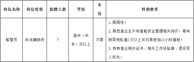 4.年龄在18周岁以上,40周岁以下(1985年1月5日至2008年1月6日之间出生)。符合招聘岗位要求的相关条件,熟悉渔业生产和渔船安全管理相关知识,熟练掌握办公软件的操作,具备一定的信息收集、整理和分析能力。